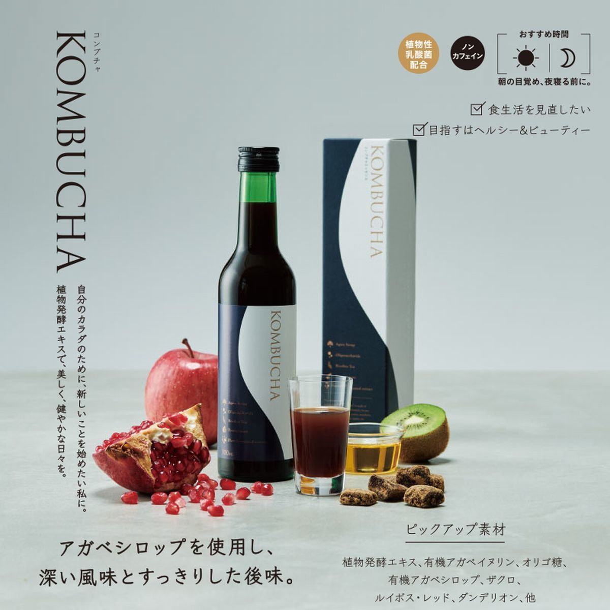 有機アガベシロップ(メキシコ製造)、イソマルトオリゴ糖液糖(国内製造)、ザクロ果汁、有機アガベイヌリン、植物発酵物(黒糖、オレンジ、パイナップル、バナナ、りんご、その他)、植物発酵エキス(黒糖、キャベツ、大根、たまねぎ、みかん、バナナ、人参、オレンジ、りんご、その他)、ルイボス茶抽出物、西洋タンポポ抽出物、乳酸菌(殺菌)/クエン酸、スパイス抽出物、グレープフルーツ種子抽出物、(一部にオレンジ・カシューナッツ・キウイフルーツ・くるみ・ごま・大豆・バナナ・やまいも・りんごを含む