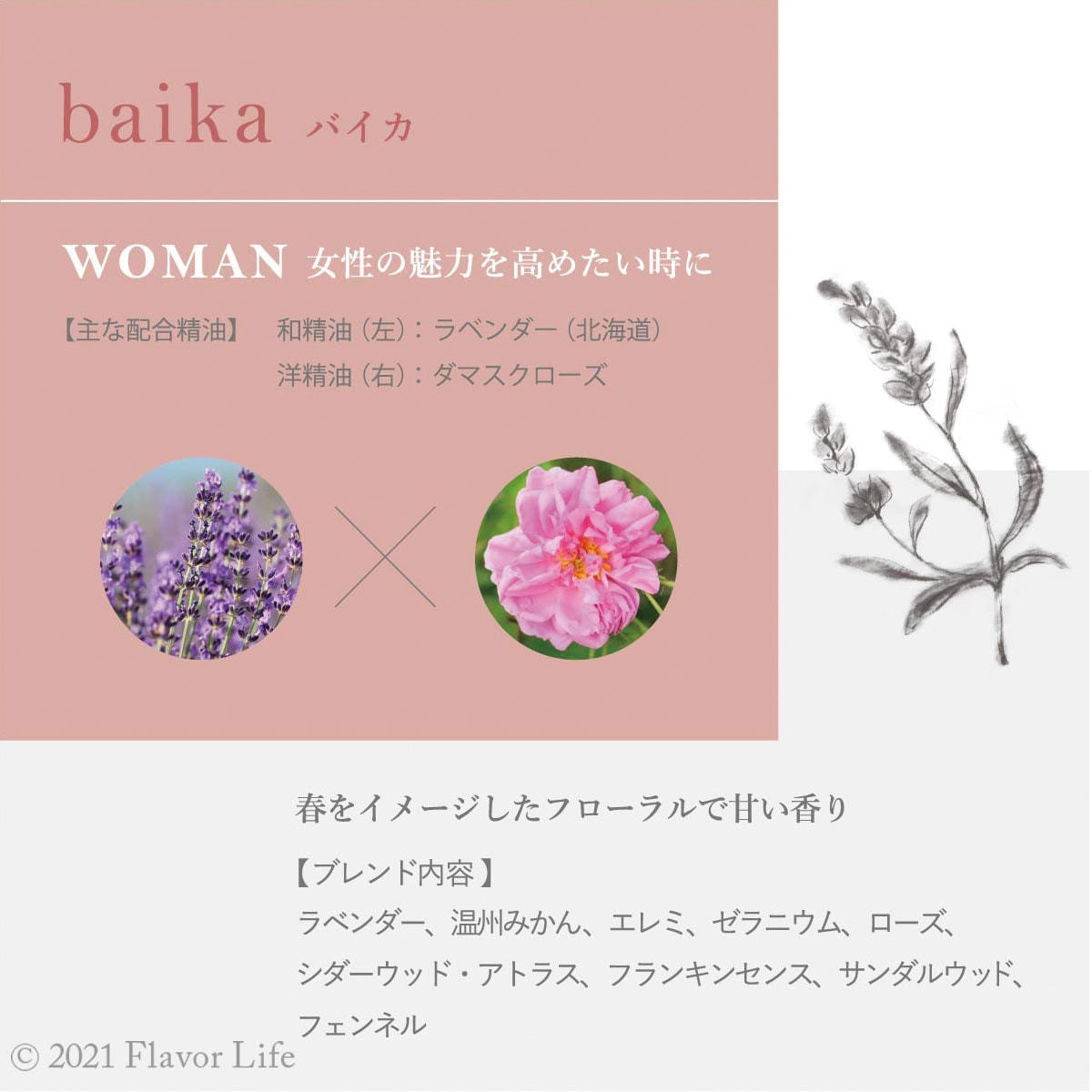 ・配合精油:ラベンダー、温州みかん、エレミ、ゼラニウム、ローズ、シダーウッド・アトラス、フランキンセンス、サンダルウッド、フェンネル