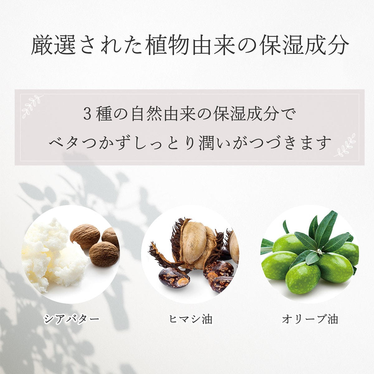水、ヒマシ油、グリセリン、シア脂、セタノール、(アクリル酸ヒドロキシエチル/アクリロイルジメチルタウリンNa)コポリマー、ウンシュウミカン果皮エキス、オレンジ果皮油、オリーブ果実油、プロパンジオール、ステアリン酸グリセリル(SE)、リンゴ酸ジイソステアリル、イソステアリン酸ソルビタン、ポリソルベート60、ブチルカルバミン酸ヨウ化プロピニル、BG