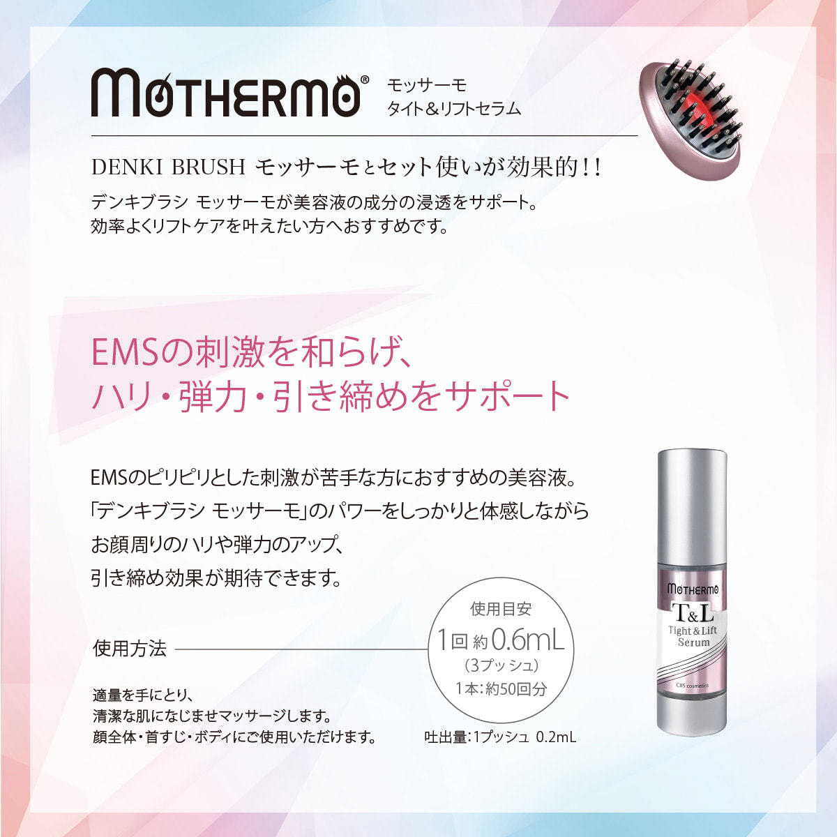 「デンキブラシモッサーモⓇ」とセット使いが効果的で、デンキブラシモッサーモⓇが美容液の成分の浸透をサポート。