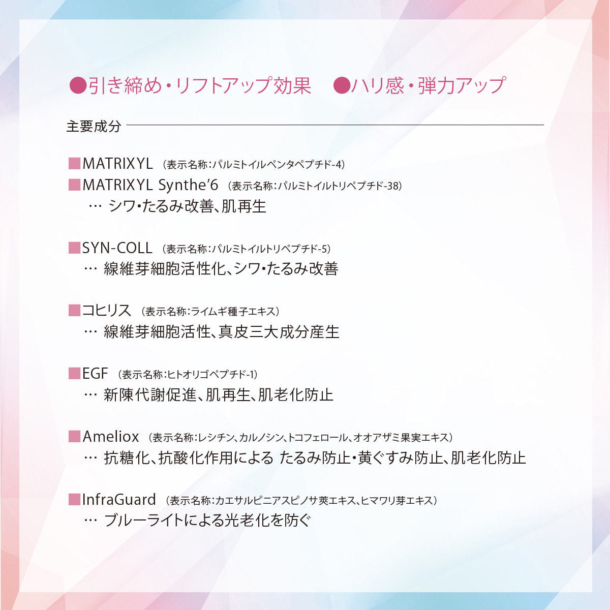 水、グリセリン、BG、プロパンジオール、メチルグルセス-10、(エイコサン二酸/テトラデカン二酸)ポリグリセリル-10、パルミトイルペンタペプチド-4、パルミトイルトリペプチド-38、パルミトイルトリペプチド-5、ライムギ種子エキス、ヒトオリゴペプチド-1、レシチン、カルノシン、トコフェロール、オオアザミ果実エキス、ザクロ果実エキス、加水分解コラーゲン、カエサルピニアスピノサ莢エキス、ヒマワリ芽エキス、アラントイン、ジグリセリン、ポリソルベート20、乳酸Na、ヒドロキシプロピルシクロデキストリン、マルトデキストリン、ペンチレングリコール、エタノール、水酸化K、カルボマー、カプリリルグリコール