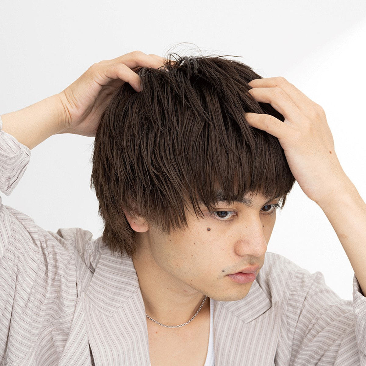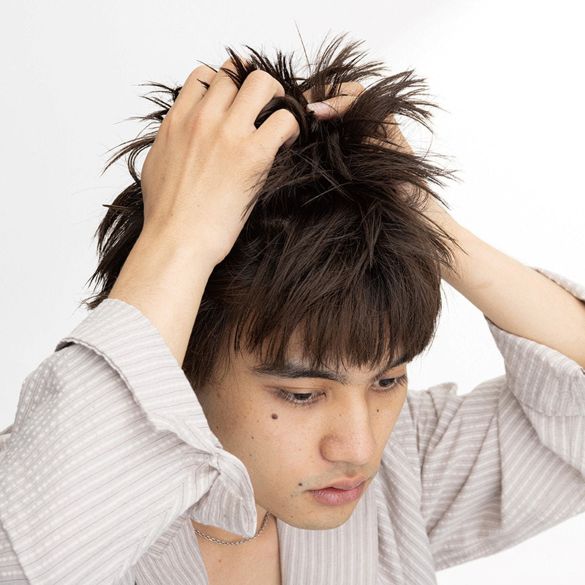 ②指を立ててジグザグしながら立ち上がった髪を下ろして整えます。